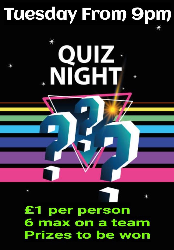 Wednesday is here mid week fun day, it's QUIZ night £1 per person max 6 to a team, starts at 9pm get in early to secure a seat.. 1st 2nd and 3rd prize ro be one,